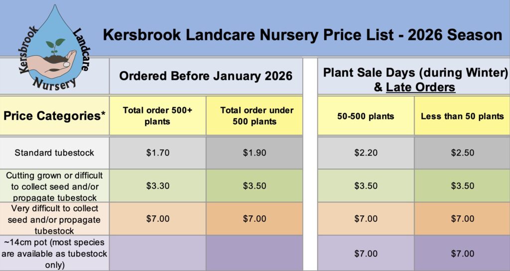 Our expected species availability for the following year is published on our website in winter to guide customers as to what plants we are growing. This is then updated after a stocktake in autumn. Please note that our species availability is subject to change and not all species will be available each year. There are many variables to consider when propagating plants including seed availability and quality, and each season’s growing conditions.